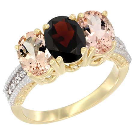 14K Yellow Gold Natural Garnet & Morganite Sides Ring 3-Stone Oval 7x5 mm Diamond Accent, sizes 5 - 10
