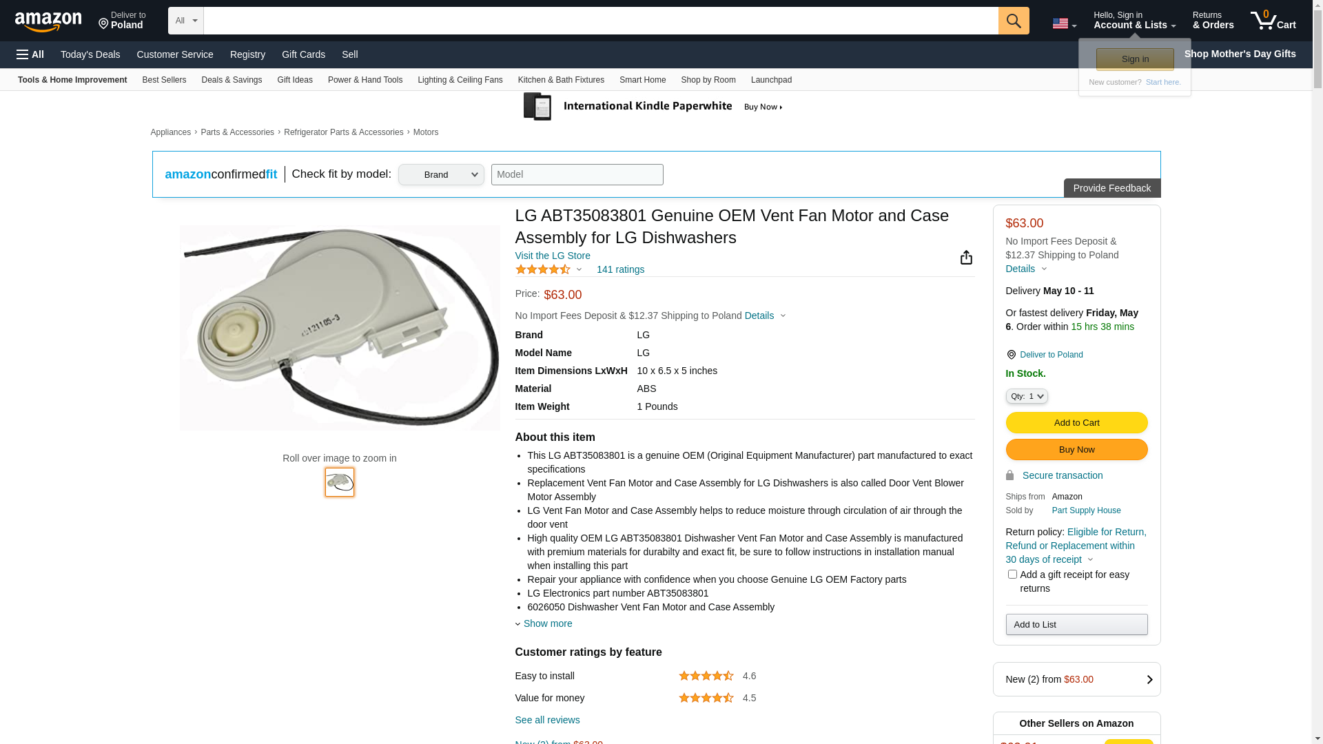 - High quality OEM LG ABT35083801 Dishwasher Vent Fan Motor and Case Assembly is manufactured with premium materials for durabilty and exact fit, be sure to follow instructions in installation manual when installing this part