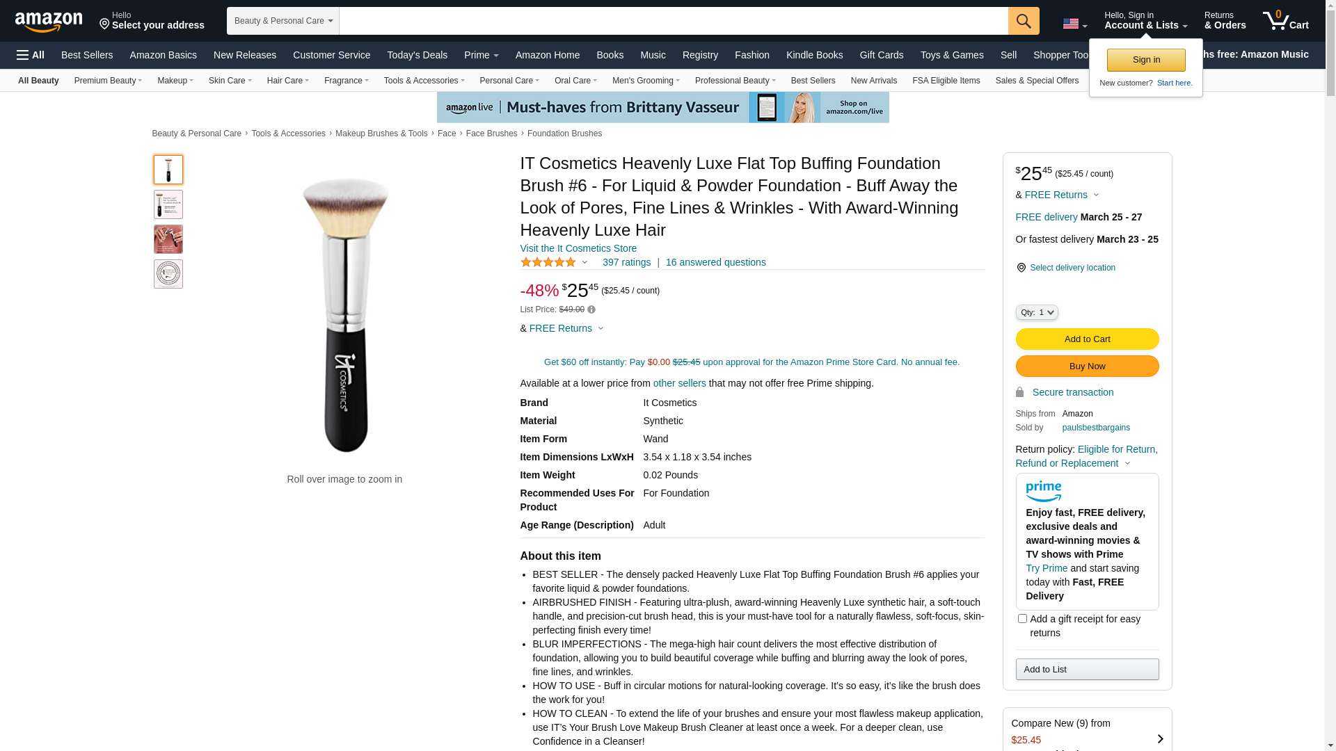 Why did IT Cosmetics create this product: IT Cosmetic creator wanted to create the perfect Flat Top Buffing Foundation Brush so women would be able to have a flawless, airbrush finish with each and every time! What is it: The Heavenly Luxe Flat Top Buffing Foundation Brush is the most ultra-luxe, ultra-plush tool for perfect airbrush application. Who is it for: Anyone who wants to instantly buff away conceal imperfections, blur away pores from view, and achieve a more radiant looking, flawless and air-brushed complexion. Why is it different: This flat top, super-luxe buffing brush is 100% cruelty-free and is designed to let you quickly apply your foundation to a soft, airbrushed finish. Heavenly Luxe Flat Top Buffing Foundation Brush contains over 88,000 high quality hairs. Features 100% synthetic bristles. Vegan