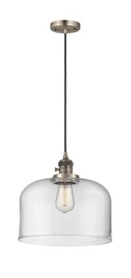 INNOVATIONS 201CSW-AB-G72-L 1-Light Mini Pendant Antique Brass. Collection: Franklin Restoration. Style: Industrial, Farmhouse, Restoration-Vintage, Traditional. Metal Finish: Antique Brass. Metal Finish (Canopy/Backplate): Antique Brass. Material: Steel, Cast Brass, Glass. Dimension(in): 8(H) x 12(W) x 12(Dia). Min/Max Height (Fixture Height with Cord or Included Stems & Canopy)(in): 15.25/133.25. Wire/Cord: 10 Feet Of Black Textured Cord. Bulb: (1)60W Medium Base,Dimmable(Not Included). Maximum Wattage Per Socket: 100. Voltage: 120. Color Temperature (Kelvin): 2200. CRI: 99.9. Lumens: 220. Glass Shade Description: Clear X-Large Bell. Glass or Metal Shade Color: Clear. Shade Material: Glass. Glass Type: Transparent. Shade Shape: Bell. Shade Dimension(in): 12(W) x 8(H). Fitter Measurement (Glass Or Metal Shade Fitter Size): 3.25 inch Fitter. Canopy Dimension(in): 4.5(Dia) x 0.75(H). Sloped Ceiling Compatible: Yes. California Proposition 65 Warning Required: Yes. UL & ETL Certification: Damp Location.