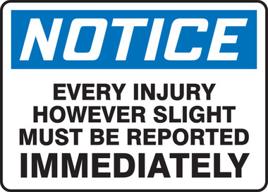 Accuform MFSD801VS Sign, Legend "Notice Every Injury However Slight Must BE REPORTED Immediately", 10" Length x 14" Width x 0.004" Thickness, Adhesive Vinyl, 10" x 14", Blue/Black on White