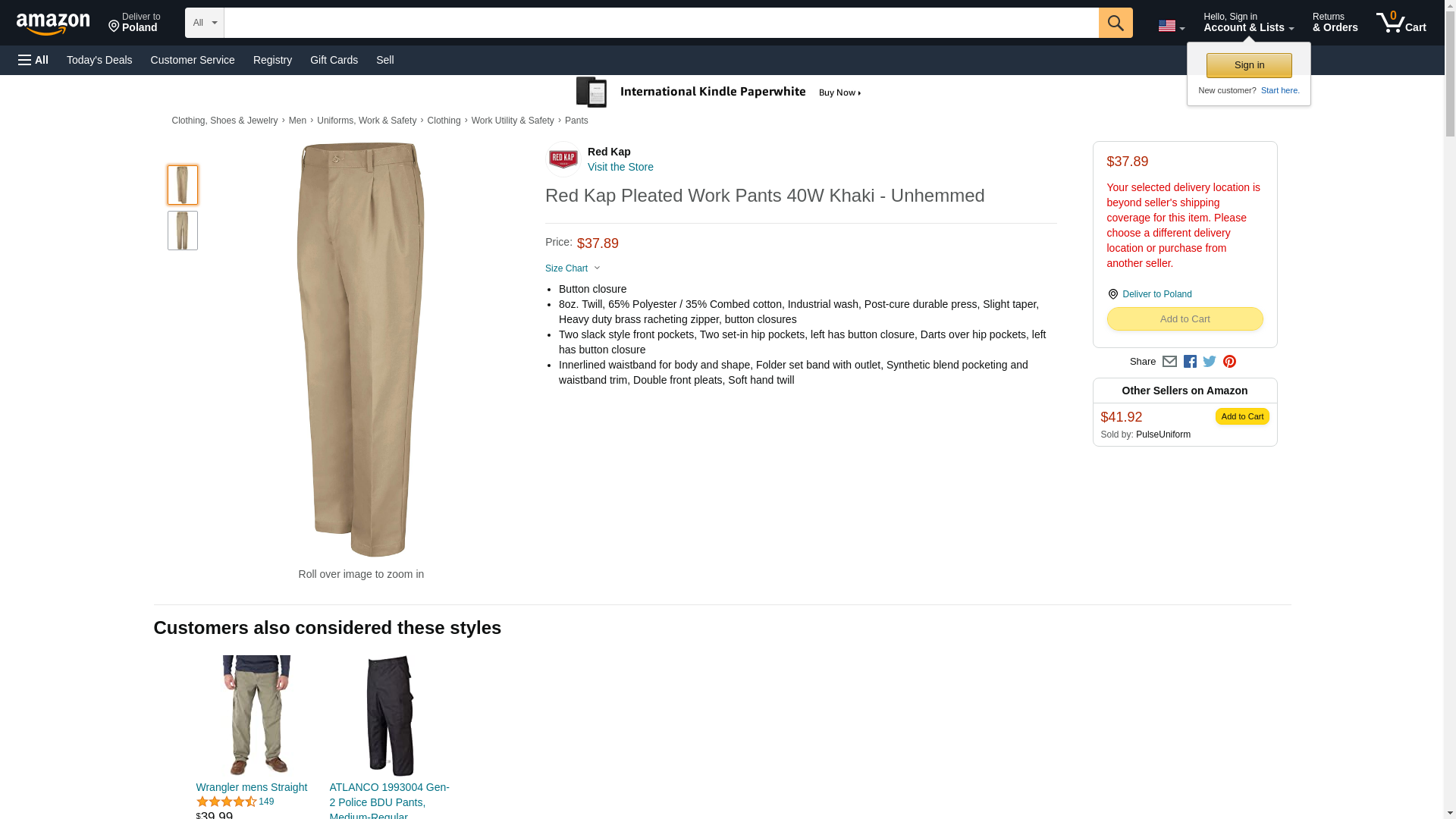 Red Kap Pleated Work Pants 40W Khaki - Unhemmed