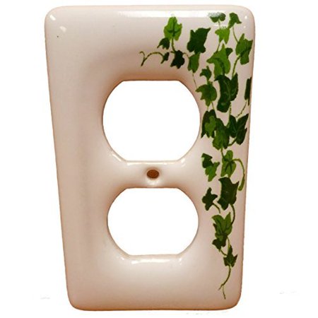 Leviton 89503-GRN green vine ceramic duplex outlet cover decorated with a green vine pattern. residential grade, standard size single-gang wallplates measuring 4.5"h x 2.75"w with one duplex receptacle opening.