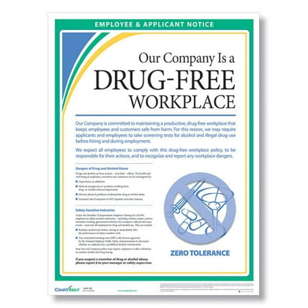 <li>Make employees and applicants aware of your commitment to a safe, drug-free environment. This poster helps reinforce your substance abuse policy and create a sense of trust and safety in your company. It explains that screening tests for alcohol and illegal drug use may be required, the dangers of drug use and relevant laws.</li> <li>Sold Individually as 1 Each.</li> <li></li>