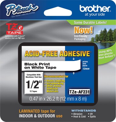 Acid-free adhesive makes these labels safe for photo albums and memory books. The ideal way to label precious memories. Label Size - text: 1/2" x 26 1/5 ft.; Label Color(s): White; Machine Compatibility: Brother P-Touch PT-1000, PT-1000BM, PT-1010, PT-1010B, PT-1010NB, PT-1010RDT, PT-1010S, PT-1090, PT-1090BK, PT-1100, PT1100SB, PT-1100SBVP, PT-1100ST, PT-1120, PT-1130, PT-1160, PT-1170, PT-1180, PT-1190, PT-11Q, PT-1200, PT-1230PC, PT-1280, PT-1280SP, PT-1280SR, PT-1280TG, PT-1280VP, PT-128AF, PT-1290, PT-1290RS, PT-1290SBVP, PT-1300, PT-1400, PT-1500, PT-1500PC, PT-1600, PT-1700, PT-1750, PT-1800, PT-1810, PT-1830, PT-1830C, PT-1830SC, PT-1830VP, PT-1880, PT-1880C, PT-1880SC, PT-1880W, PT-1890C, PT-1890SC, PT-1890W, PT-18R, PT-18RKT, PT-1900, PT-1910, PT-1950, PT-1960, PT-200, PT-2030, PT-2030AD, PT-2030VP, PT-2100, PT-2110, PT-2200, PT-2210, PT-2300, PT-2310, PT-2400, PT-2410, PT-2430PC, PT-2500PC, PT-2600, PT-2610, PT-2700, PT-2710, PT-2730, PT-2730VP, PT-300, PT-300B, PT-310, PT-310B, PT-320, PT-330, PT-340, PT-350, PT-3600, PT-4000, PT-520, PT-530, PT-540, PT-550, PT-580C, PT-6100, PT-7100, PT-9200DX, PT-9200PC, PT-9400, PT-9500PC, PT-9600, PT-9700PC, PT-9800PCN, PT-D200, PT-D200BT, PT-D200DA, PT-D200MA, PT-D200SA, PT-D210, PT-D210BK, PT-D400, PT-D400AD, PT-D400VP, PT-D450, PT-D600, PT-D600VP, PT-E100, PT-E300, PT-E300VP, PT-E500, PT-E500VP, PT-E550W, PT-E550WVP, PT-H100, PT-H300, PT-H300LI, PT-H500LI, PT-P700, PT-P750W, PT-P750WVP, PT-P900W, PT-P950NW, ST-1150, ST-1150DX, ST-5; Printed Text Color(s): Black.