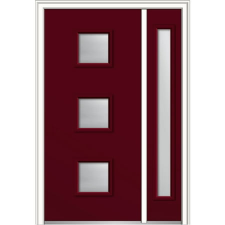 <ul> <li>Door Size: 50"x80"</li> <li>Unit Dimension: 53"x81.75"</li> <li>Rough Opening: 53.5"x82.25"</li> <li>Fiberglass Smooth Door With Sidelite</li> <li>6-9/16" Primed Compostie Frame</li> <li>Spotlight 3-Lite Square Clear Glass</li> <li>Door Prefinished Burgundy</li> <li>Right Hand In-Swing</li> <li>Right Hand In-Swing Door Handing - Standing on the inside of your home, if your hinge pins are on your right, you have a Right Hand In-Swing</li> <li>3 Satin Nickel Hinges - 2-1/8" Entry/Deadbolt Bore Prep - *Locks Sold Separately*</li> <li>Brickmould Applied</li> <li>Hinge Side-Right Hand - Sidelite on Hinge Side -Viewed from Exterior of your home sidelite is on the right</li> </ul>