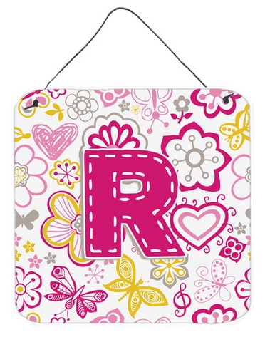 Caroline's Treasures CJ2005-RDS66 Letter R Flowers and Butterflies Pink Wall or Door Hanging Prints Aluminum Metal Sign Kitchen Wall Bar Bathroom Plaque Home Decor, 6x6, Multicolor