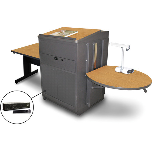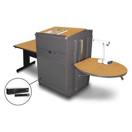 MVLTRM3630OKDT-H Finish: Oak Features: -Vizion collection. -Locking equipment cabinet for CPU. -Wireless 16 channel UHF handheld microphone. -Removable lectern. -Media center with Desk and lectern. -50 Watt amplifier. Style: -Modern. Primary Material: -Metal. Storage Included: -Yes. Clock Included: -Yes. Reading Light Included: -Yes. Wireless: -Yes. Sound System Included: -Yes. Country of Manufacture: -United States. Dimensions: -Adjustable platform height: 26"- 42". -6 Speakers size: 2". Overall Height - Top to Bottom: -47". Adjustable Height: -Yes. Overall Width - Side to Side: -78". Overall Depth - Front to Back: -36". Overall Product Weight: -265 lbs.