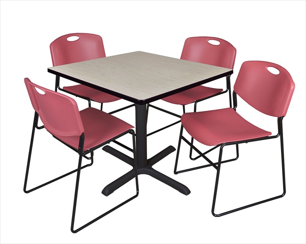 Cain 42" Square Breakroom Table- Maple & 4 Zeng Stack Chairs- Burgundy
