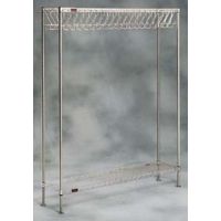 Freestanding gowning rack incorporates wire shelving components that offer a more economical rack option for less demanding environments. Hooks on all four shelf sides are spaced on 1 1/2" centers and are staggered 1" vertically hook-to-hook for ease of access. Open wire construction facilitates laminar flow. Convenient for storage of lab coats, uniforms and garments.