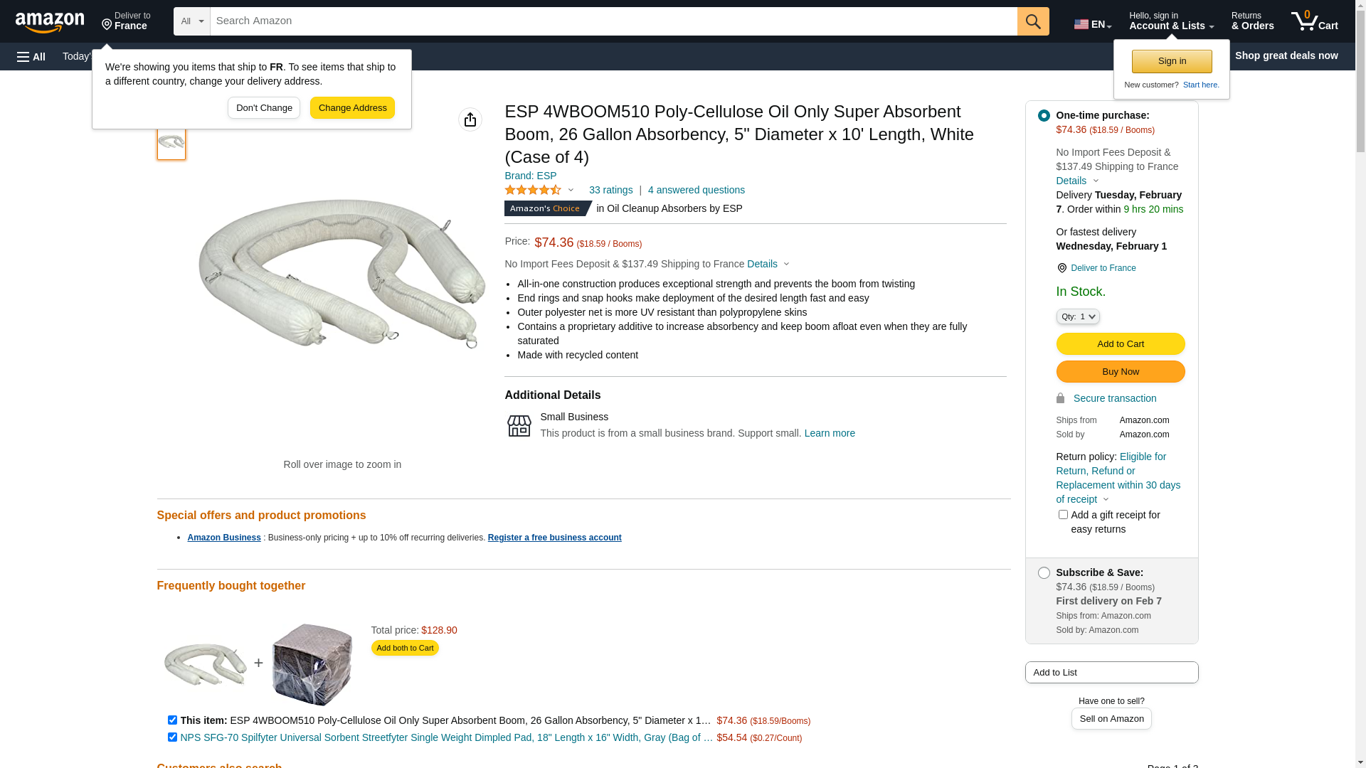 ESP 4WBOOM510 Poly-Cellulose Oil Only Super Absorbent Boom, 26 Gallon Absorbency, 5" Diameter x 10' Length, White (Case of 4)