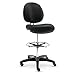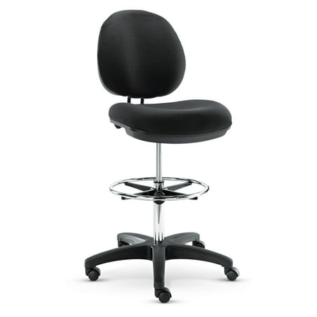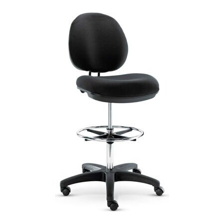 Molded plastic shell resists impact. Waterfall seat edge helps relieve pressure points on the underside of legs. Adjustable footring for optimal feet positioning. Five-star base with casters for easy mobility. Optional arms sold separately. Recommended Applications: Drafting, Warehouse & Industrial--Stools; Seat/Back Color: Black; Arms Included: No; Pneumatic Seat Height Adjustment: Yes.