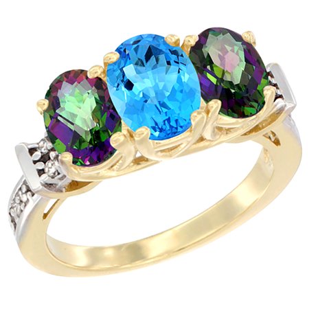 10K Yellow Gold Natural Swiss Blue Topaz & Mystic Topaz Sides Ring 3-Stone Oval Diamond Accent, sizes 5 - 10