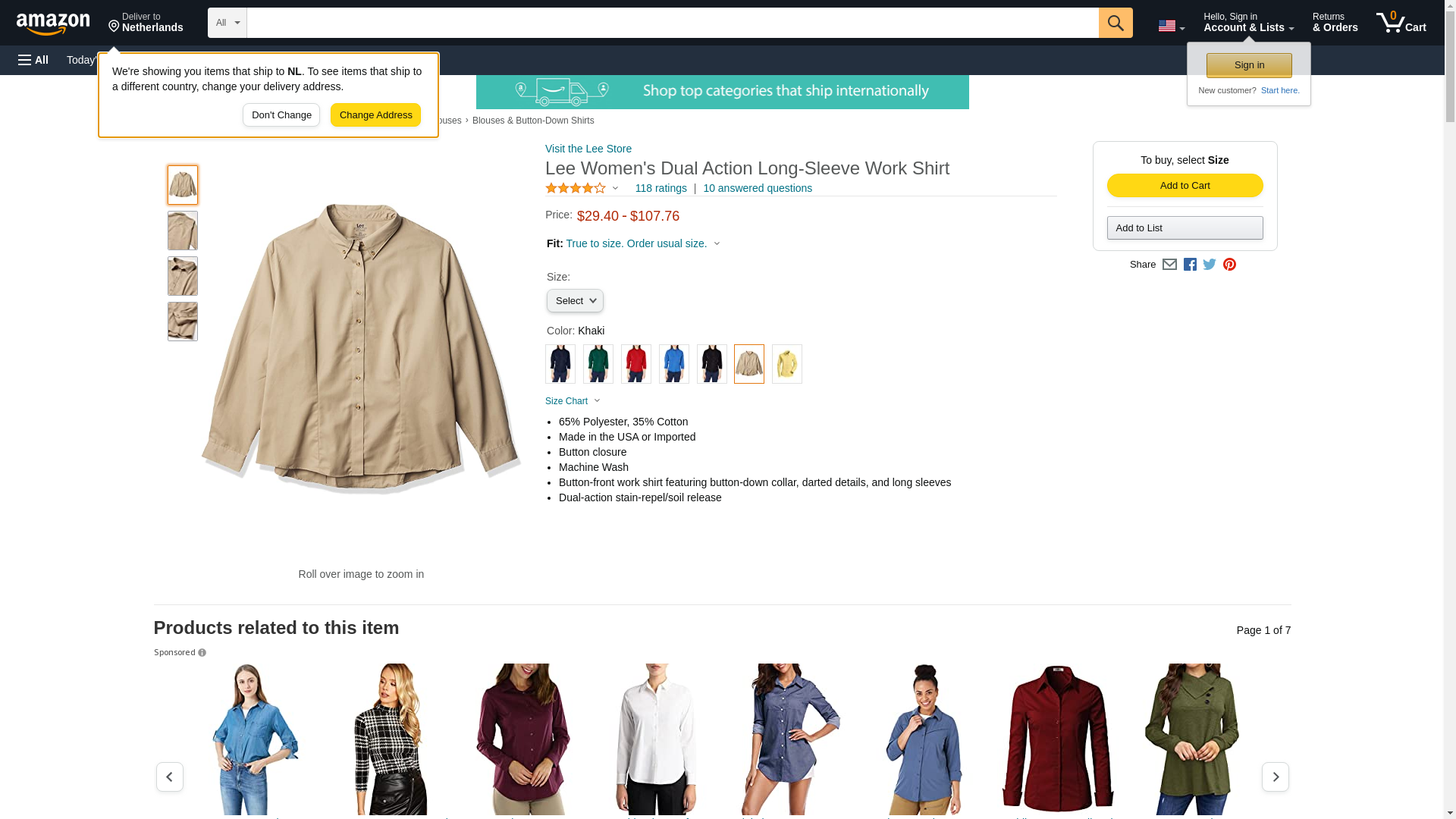 | Feature | Button-front work shirt featuring button-down collar, darted details, and long sleeves |