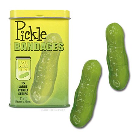 Keep pickle brine out of your cuts, scrapes, and boo-boos with these hilarious self-adhesive bandages. <br /> <ul> <li>Pickle Bandages</li> <li>Large Sized 3"x 1" Adhesive "Band-Aids"</li> <li>Non-Stick Pad</li> <li>15 3" x 1"Sterile Bandages</li> <li>Free Prize In Every Tin</li> </ul>