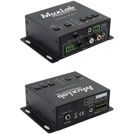 The MuxLab 500216US Audio Zone Amplifier is a Class D digital amplifier that allows one 1 analog source to be distributed to a pair of 20W per channel stereo speakers within a zone The Audio Zone Amplifier can be cascaded infinitely across multiple zones to give a multiroom audio solution The Audio Zone Amplifier features two 2 stereo analog audio input lines microphone input with 48V phantom supply and two 2 20W 4ohm speaker outputs or one 1 40W 8ohm speaker output Volume and source control via the front push buttons or via IR using the optional IR Sensor Handheld Remote Control Kit 500216IR Features. Two Analog Stereo Audio Inputs. Microphone input with 48V phantom supply. 20W per channel into 4ohm. Cascadeable to further amplifiers. Compatible with MuxLab HiFi Audio Baluns and Audio Matrix Switch. Volume control. Ground loop isolation. Controllable via push buttons RS232 and optional IRSpecifications. Environment Audio Distribution. Power Output 20W RMS maximum per channel into 4 ohm. Front Control Input select Volume Bass Treble Mute. Power Requirement 60W max 24VDC 25A. Compatible Source Unit Line level Analog Audio. Gain 26dB. Frequency 20Hz to 20KHz. Control Push buttons RS232 and Optional IR. Temperature Operating 32deg to 90degF 0deg to 40degC. Storage 40deg to 185degF 40deg to 85degC. Humidity Maximum 90 noncondensing. Enclosure Metal black painted. Dimension 49 x 35 x 15 123 x 87 x 38cm. Weight 1 lbs