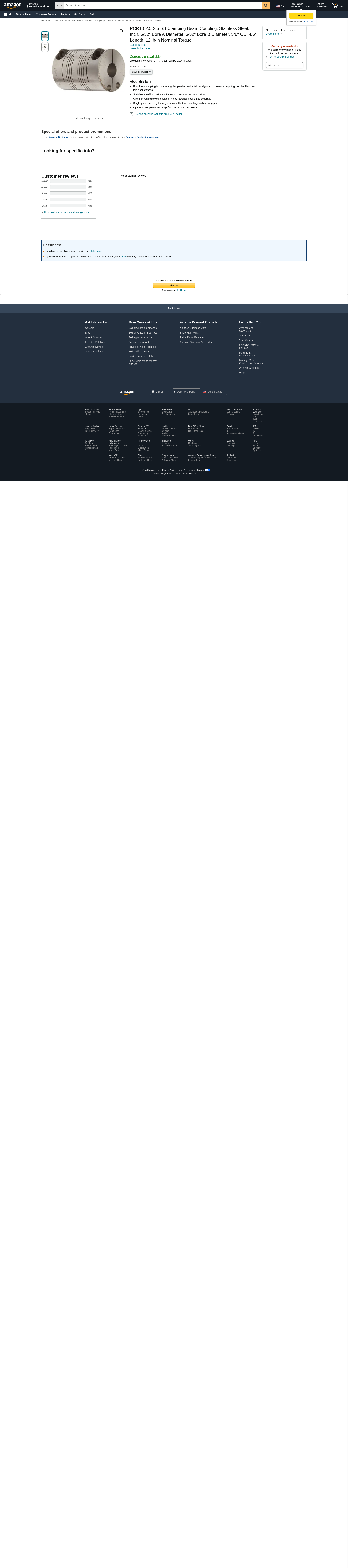 Ruland PCR10-2.5-2.5-SS Clamping Beam Coupling, Stainless Steel, Inch, 5/32" Bore A Diameter, 5/32" Bore B Diameter, 5/8" OD, 4/5" Length, 12 lb-in Nominal Torque