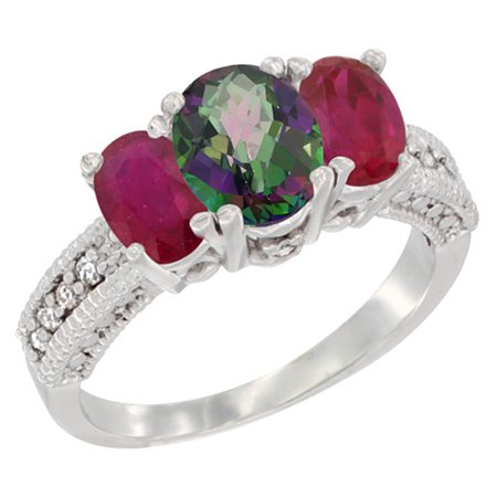 14K White Gold Diamond Natural Mystic Topaz Ring Oval 3-stone with Enhanced Ruby, sizes 5 - 10