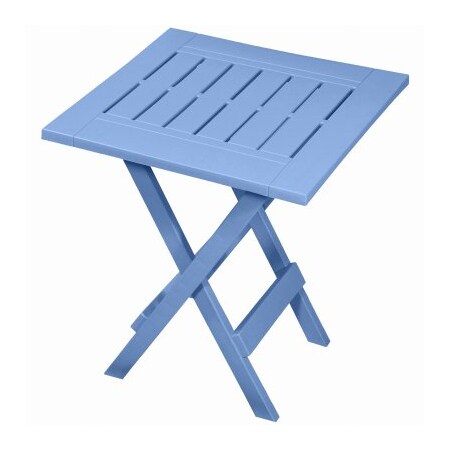 Gracious Living, folding table, Blue Heaven. Coordinates with the Adirondack collection. Contemporary slat design. Folds for convenient storage. Made from easy care weather resistant resin that is fade resistant. Boxed in a PDQ.