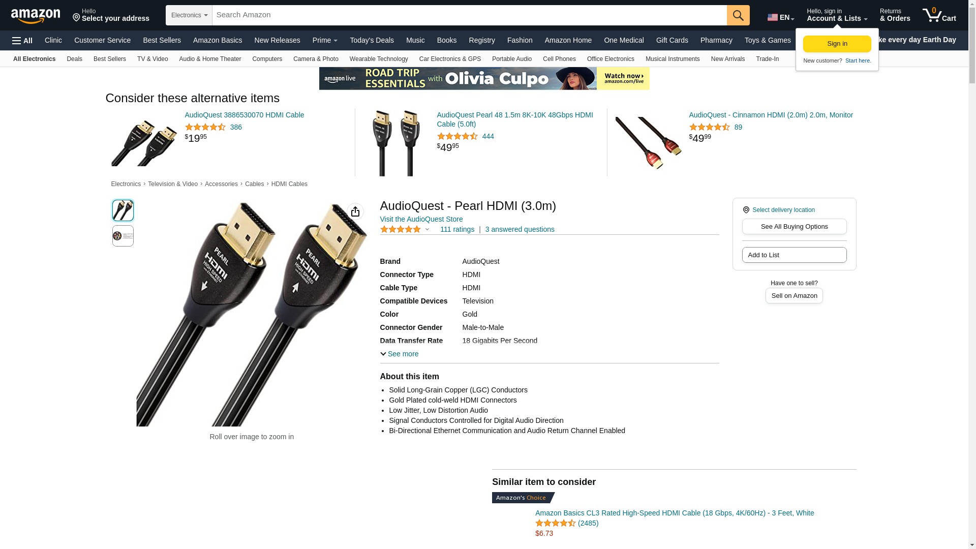 Extremely Affordable AudioQuest Pearl HDMI Cable Delivers High-Performance, High-Resolution Video and Superb Clarity: High Speed With Ethernet-Approved Cable Supports 4k, 3D, 1080p Video Feast your eyes on extremely affordable, high-performance, high-resolution video with the AudioQuest Pearl HDMI cable, capable of transmitting 3D and 4k video with superb dynamics and eye-popping color. Pearl also delivers all of the data required for 120/240/600Hz displays, multichannel audio, and 1080p with stunning accuracy and clarity. A High Speed with Ethernet-approved design (up to 10 meters), Pearl features solid Long-Grain Copper conductors, solid high-density polyethylene insulation, and precise geometry – hallmarks associated with AudioQuest cables for the past few decades. It can also be used as an audio-return channel for sending Dolby Digital from an HDTV to a receiver. No matter your HDMI needs, don't settle for anything less than Pearl, backed by our 100% Satisfaction Guarantee. 18Gbps Pearl HDMI cables are guaranteed to have the 18Gbps bandwidth required for compelling features like 8K/30 video, HDR (High Dynamic Range) imagery, and eARC (enhanced Audio Return Channel). Superb Clarity, Less Distortion: Solid Long-Grain Copper Conductors, Polyethylene Insulation Solid conductors eliminate strand-interaction distortion. Pearl's solid Long-Grain Copper allows a smoother and clearer sound than cables using regular OFHC (Oxygen-Free High-Conductivity) copper. OFHC is a general metal industry specification regarding "loss" without any concern for distortion. LGC has fewer oxides within the conducting material, less impurities, less grain boundaries, and better performance. And because air absorbs next to no energy and polyethylene is low-loss and has a benign distortion profile, Pearl uses air-filled foamed-polyethylene insulation. Thanks to all the ai
