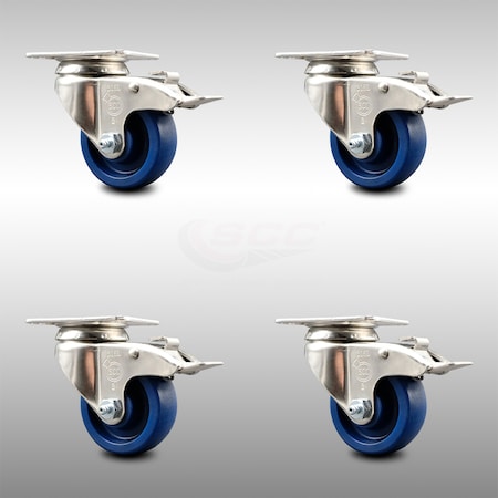 Listing is for a set of four (4) Service Caster Series #20 316 stainless steel swivel casters, four (4) swivel casters with total lock brakes, 3.5” diameter by 1-1/4” wide blue solid polyurethane wheels. Supports a total weight of 1,200lbs (300lbs/per caster). When searching for a reliable and durable solution to your caster needs, consider Service Caster's 316 stainless steel solid polyurethane wheel casters. Built with 316 stainless steel, which contains additional molybdenum and nickel content, makes this caster more corrosion resistant than standard 304 stainless steel. Molded as one solid piece, the non-marking, non-marring polyurethane wheel is free from debonding, and will not flatspot, as can occur with comparable polyurethane wheels, ensuring a smooth and solid roll over long periods of time. Mounting options include top plate, bolt hole, expanding stem and standard and metric threaded stem sizes. These versatile casters are ideal for a wide range of applications, such as dollies, platform trucks, warehouse carts and freight terminals. Or ensure a secure ride for food service carts, hotel housekeeping carts, and industrial and commercial equipment.