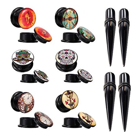 <b>BodyJ4You Plugs and Tapers Gauges Kit Ear 16PC Stretching Set Double Flare Screw Fit Acrylic 4G-14mm </b> <br /> This is a big ear plugs and taper set that is perfect for those who enjoy a variety of options at an unbeatable price! <br /> This set 16 pieces set includes : <br /> 2 Pieces of steam punk clock acrylic screw-fit stash plugs, <br />2 Pieces of vintage anchor acrylic screw-fit plug, <br />2 Pieces of hipster sugar skull acrylic screw fit plugs, <br />2 Pieces of pink sugar acrylic screw-fit stash plug, <br />2 Pieces of slit eyes acrylic screw-fit stash plug , <br /> 2 Pieces of dragon eye acrylic screw-fit stash plugs, <br /> And 4 pieces of acrylic black straight tapers. <br />8 pairs of the size you select. This set comes in a variety of sizes including: 4G (5mm), 2G (6mm), 0G (8mm), 00G (10mm), 0.5" (12mm), 9/16" (14mm) <br /> All individual styles are packaged separately. All styles are all lightweight and comfortable to wear. <br /> <br />We strive to bring you the highest quality jewelry at unbeatable prices. <br />This is why we are sure you will be more than satisfied with our services. <br />Here at <b>BodyJ4you</b> we offer a specialized customer service team that is available seven days a week to answer any product questions before, during or after the purchase. <br />If you're not satisfied for any reason, you may return your unused item within 30 days of purchase. <br /> <br />