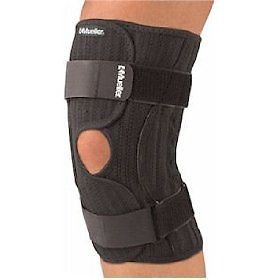 Made by Mueller. This light-weight brace provides support for stiff, weak or sore knees. It has flexible steel springs on both sides that provide moderate medial and lateral support without restricting the mobility. It has a wrap-around design with adjustable straps that allow for controlled compression and a custom fit. It is made out of a breathable material that has a soft inner lining that provides comfort for all-day wear. It has fully trimmed edges and smooth seams that help to prevent irritation and chafing.