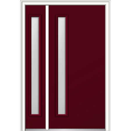 <ul> <li>Door Size: 48"x80"</li> <li>Unit Dimension: 51"x81.75"</li> <li>Rough Opening: 51.5"x82.25"</li> <li>Fiberglass Smooth Door With Sidelite</li> <li>4-9/16" Primed Composite Frame</li> <li>Spotlight 1-Lite Frosted Glass</li> <li>Door Prefinished Burgundy</li> <li>Right Hand In-Swing</li> <li>Right Hand In-Swing Door Handing - Standing on the inside of your home, if your hinge pins are on your right, you have a Right Hand In-Swing</li> <li>3 Satin Nickel Hinges - 2-1/8" Entry/Deadbolt Bore Prep - *Locks Sold Separately*</li> <li>Brickmould Applied</li> <li>Strike Side-Right Hand - Sidelite on Strike Side -Viewed from Exterior of your home sidelite is on the left</li> <li>Door Lite Strike Side - Viewed from exterior of your home sidelite is on the left.</li> </ul>