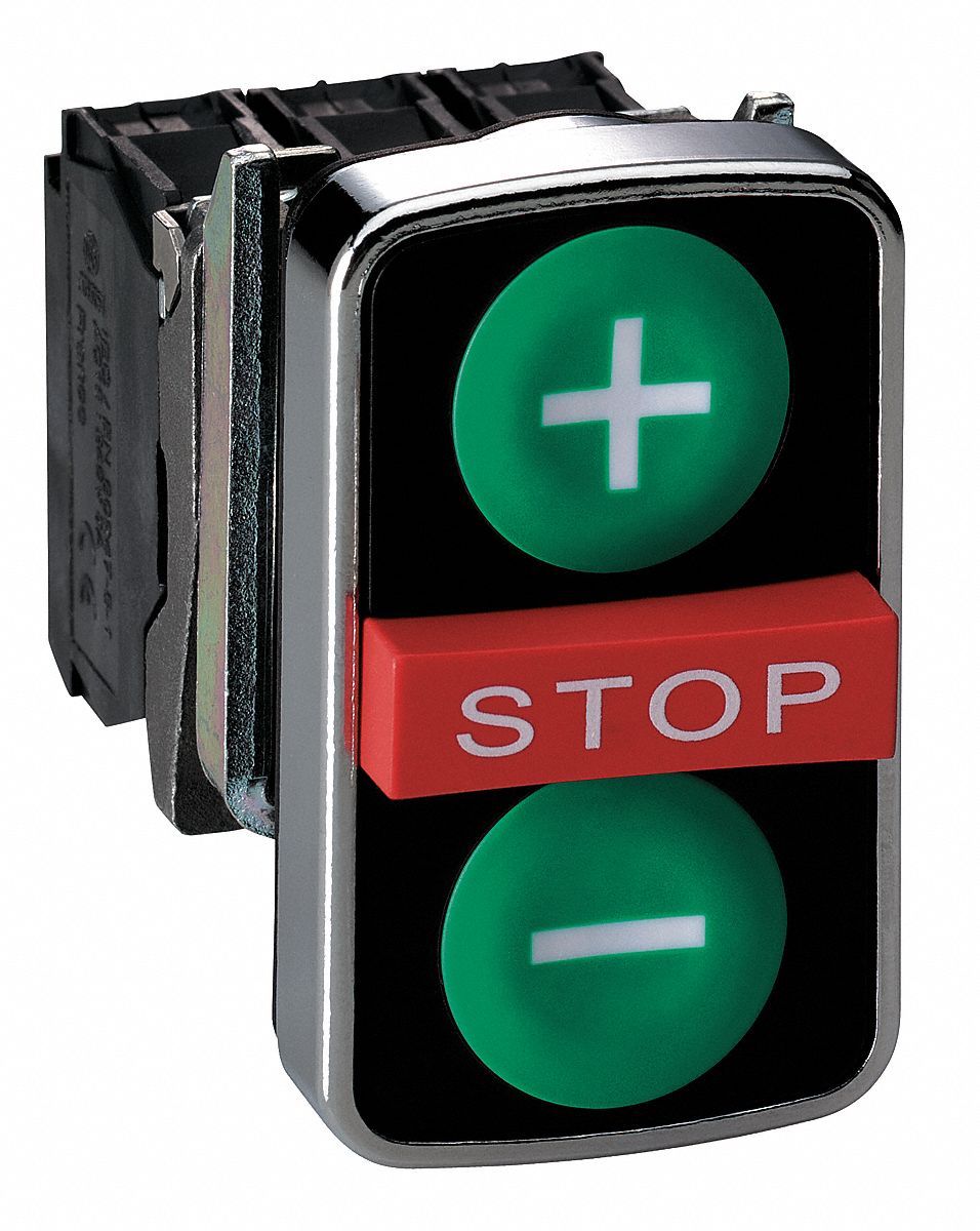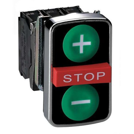 Non-Illuminated Multihead Operator Number of Heads 3 Legend/Background Color White/Green White/Red Shape Rectangular Type of Operator (2) Flush Buttons (1) Extended Button Legend +/-/Stop Size 22mm Action Momentary NEMA Rating 4X 13 IP Rating 66 69K Head Material Metal Standards UL CSA EN/IEC 60947-1 EN/IEC 60947-5-1 Includes Plus Minus Marking