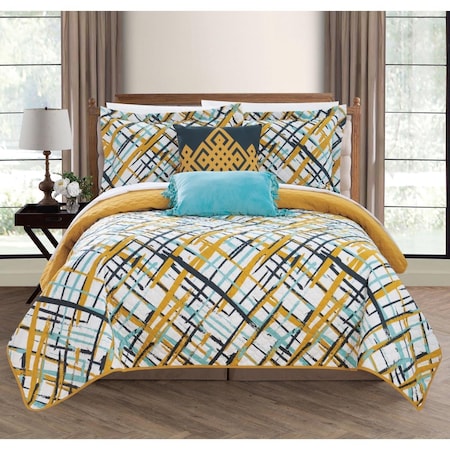 modern duvet set perfect for back to school or university with everything you need to transform a kids bedroom or dorm room. The quilt features an abstract print on the face and a solid gold backing. A color-coordinated reversible design and pillowcase, a printed geometric pattern accent pillow and a microfleece pillow with tassels are included to complete the look. Features: Soft, luxurious feel for a great night's sleep with less tossing and turning. The hypoallergenic down alternative fill is perfect for those allergic to traditional down materials. Just the right padding to keep you comfortable when the weather heats up. Built to last with premium fabrics and expert stitching. 4-Piece Set Includes: 1 Reversible Comforter 66" x 90". 1 Reversible Pillowcase 20" x 26 2". 1 printed decorative pillow 18 x 18 inches. 1 microfleece pillow with tassels 12 x 18 inches, fabric and design. Soft brushed microfiber material. Modern design with an abstract print on the face with a solid gold backing. Care instructions. Dry clean preferred. Machine washable, use a front loader or top loader without agitator to prevent tearing, use cold water on gentle cycle, tumble dry low. Add 2 tennis balls to the dryer to speed drying and add fluffiness. Specifications: Color Gold Aqua Teal White. Materials: Deluxe brushed microfiber fabric, synthetic down alternative fill. Marty Collection. Twin Twin Twin XL size. Weight: 6 pounds