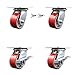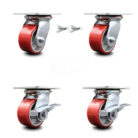 Heavy Duty Large Top Plate Polyurethane on Cast Iron Swivel Caster w/Main. Free Bearings Set of 4 w/4" x 2" Red Wheels-Includes 2 Swivel with Bolt on Swvl Lcks&2 Swvl with Brakes- Service Caster Brand