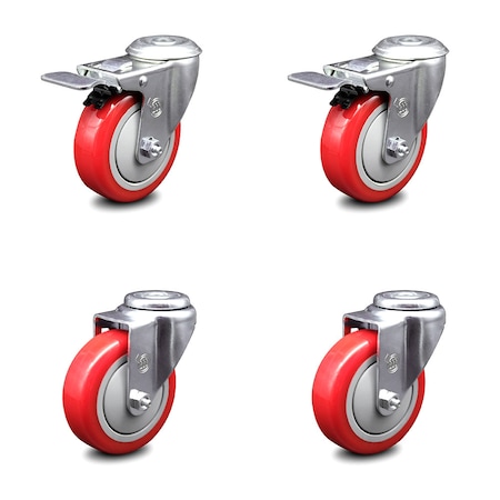 4 Inch Red Polyurethane Swivel Bolt Hole Caster Set with 2 Total Lock Brake