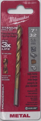 7/32" Thunderbolt Titanium Coated Drill Bit Milwaukee thunderbolt titanium coated drill bits are designed for extreme durability and long life. The thunderbolt web features a thicker core than a standard drill bit, which provides ultimate strength and protects against side-load breakage. A specially designed parabolic flute form clears chips and debris fast to keep the bit cool. A precision start, 135 split point tip starts on contact to keep the bit from walking for fast accurate holes. Excellent for drilling on curved surfaces, requires less effort to drill and is highly recommended for use with portable drills. Features: 7/32" Diameter 3-Flat Secure Grip Shank Titanium Construction Since its founding in 1924, Milwaukee has focused on a single vision: To produce the best heavy-duty electric power tools and accessories available to the professional user. Today, the Milwaukee name stands for the highest quality, durable and reliable professional tools money can buy.