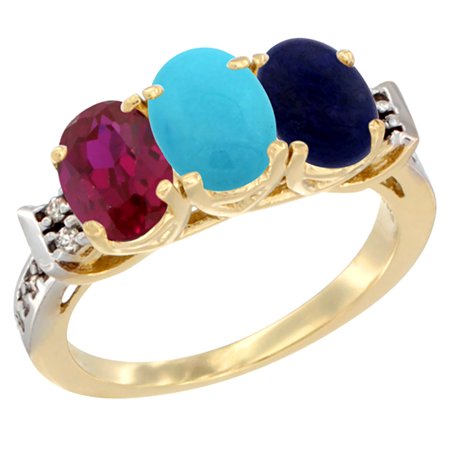 14K Yellow Gold Enhanced Ruby, Natural Turquoise & Lapis Ring 3-Stone Oval 7x5 mm Diamond Accent, sizes 5 - 10