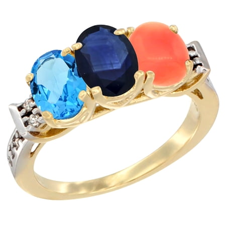 14K Yellow Gold Natural Swiss Blue Topaz, Blue Sapphire & Coral Ring 3-Stone 7x5 mm Oval Diamond Accent, sizes 5 - 10