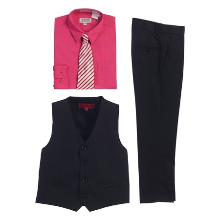 <ul> <li>A formal wear outfit from Gioberti</li> <li>Black vest, pants</li> <li>Fuchsia solid colored shirt and a striped tie</li> <li>Set is trendy and must-have for all kinds of events</li> <li>Sizing is based on U.S. clothing size standards</li> </ul>