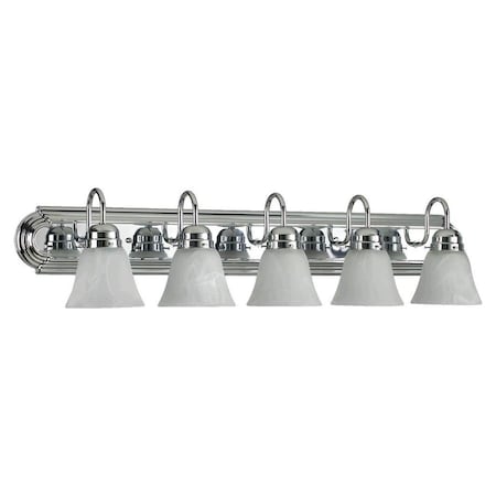 5094-5-114 Finish: Chrome Pictured in chrome Features: -Five light bath vanity.-White faux alabaster glass.-Transitional style.-UL listed for damp locations. Options: -Available in chrome, cobblestone, toasted sienna or old world finishes. Specifications: -Accommodates (5) 100W medium base bulb. Dimensions: -Overall dimensions: 8'' H x 36'' W x 7.75'' D.