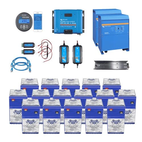 If you are interested in living off the grid, you need reliable power. Our Off-Grid 24V 800Ah GC2 Kit comes fully loaded with 16 100Ah deep cycle lithium batteries and supporting Victron components. The Off-Grid 24V 800Ah GC2 kit is a great option for those looking for more power independence while living off the grid. This kit comes equipped with a Solar Charge Controller that is rated for up to 1,450w of solar and a 24V 5000W inverter/charger. To sweeten the deal, all your components come pre-programmed too! Using only the highest quality materials all Battle Born Batteries are designed and assembled in Reno, NV. Please note, orders of six or more batteries will ship via freight and will require you to be able to accept a pallet shipment. A direct signature will also be required at the time of delivery.