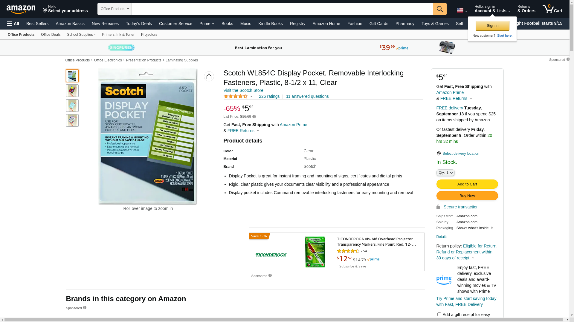 3M Wl854c Scotch Display Pocket, Plastic, for 8-1/2 X 11 Insert, Clear, 1/Each