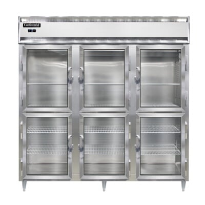 Continental Refrigerator's Designer Line Freezer, reach-in, three-section, self-contained refrigeration, aluminum exterior & interior, stainless steel front, standard depth cabinet, half-height glass doors, electronic control with digital display, hi-low alarm, 6" stainless steel legs, 2 HP, cETLus, NSF. 115/208-230v/60/1, 22.5 amps, cord & plug supplied by others, standard. Left Door hinged on left, center & right doors hinged on right, standard. 6" stainless steel adj. legs, standard.