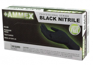 100-Pk. Ammex Black Powder-free Nitrile Exam Gloves. The pro's choice for sensitive protection. Combining superior comfort and strength with unsurpassed tactile sensitivity, these Nitrile Gloves hold up better against rips and tears than any other synthetic gloves. Textured to provide excellent non-slip wet gripping power, they are also powder-free so they won't interfere with fresh adhesives, inks, etc. Perfect for medical technicians, tattoo artists, or anywhere a high-tech, hard-working image is valued. Made from 4 mil nitrile; Textured for superior grip strength; Powder-free, no residue to get in the way of a perfect finish; Ambidextrous -- Gloves can be worn on either hand; Chlorinated Beaded cuff. State Size. Order yours today! 100-Pk. Ammex Black Powder-free Nitrile Exam Gloves
