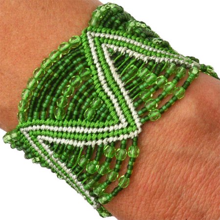 <ul> <li>Czech glass crystals and sparkly seed beads in rich shades of green and a zigzag macrame design</li> <li>100 Czech crystals measure 4 mm in diameter</li> <li>Stylish Metal Clasp</li> </ul>