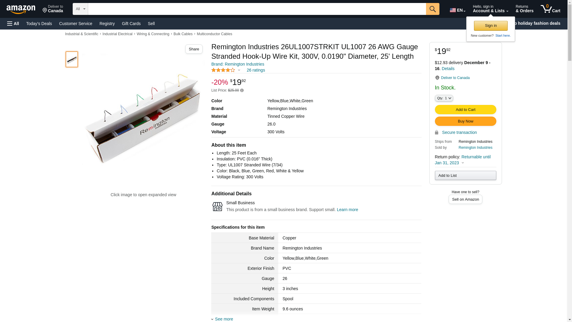 Remington Industries 26UL1007STRKIT UL1007 26 AWG Gauge Stranded Hook-Up Wire Kit, 300V, 0.0190" Diameter, 25' Length