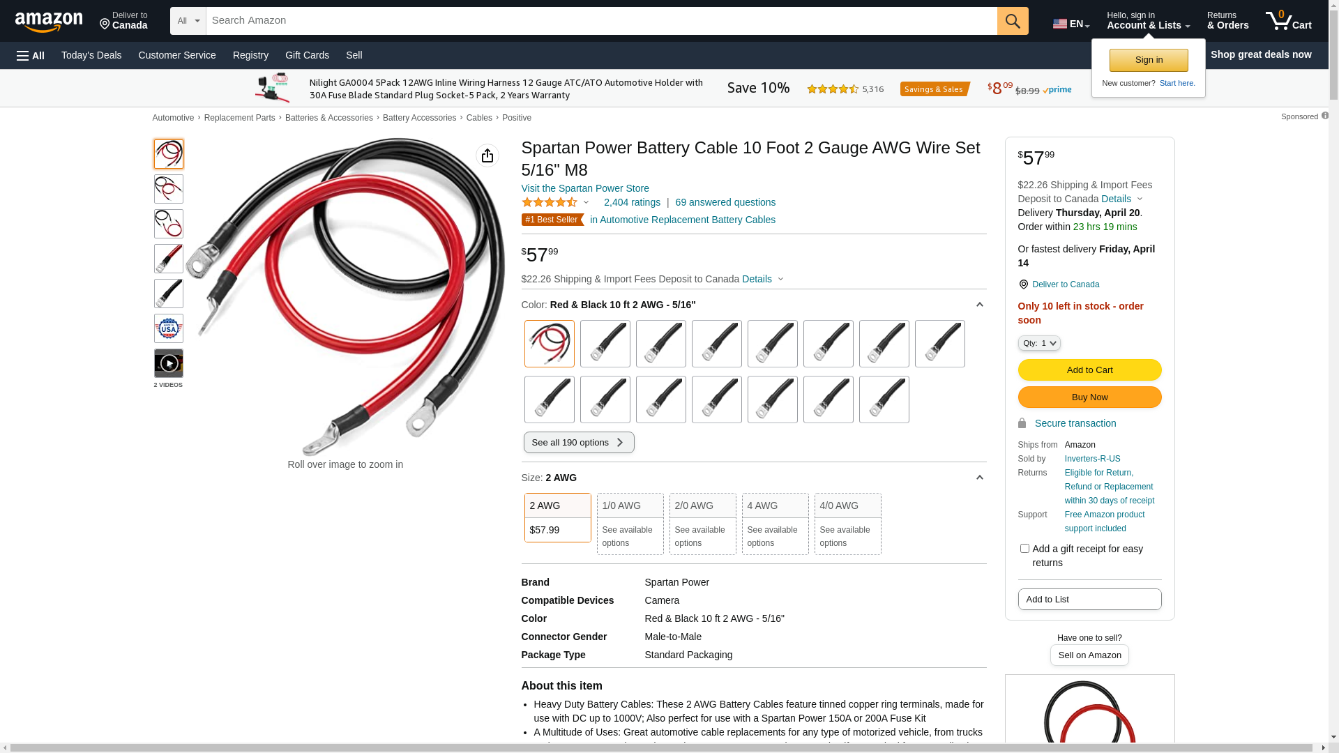 Spartan Power Battery Cable 10 Foot 2 Gauge AWG Wire Set 5/16" M8