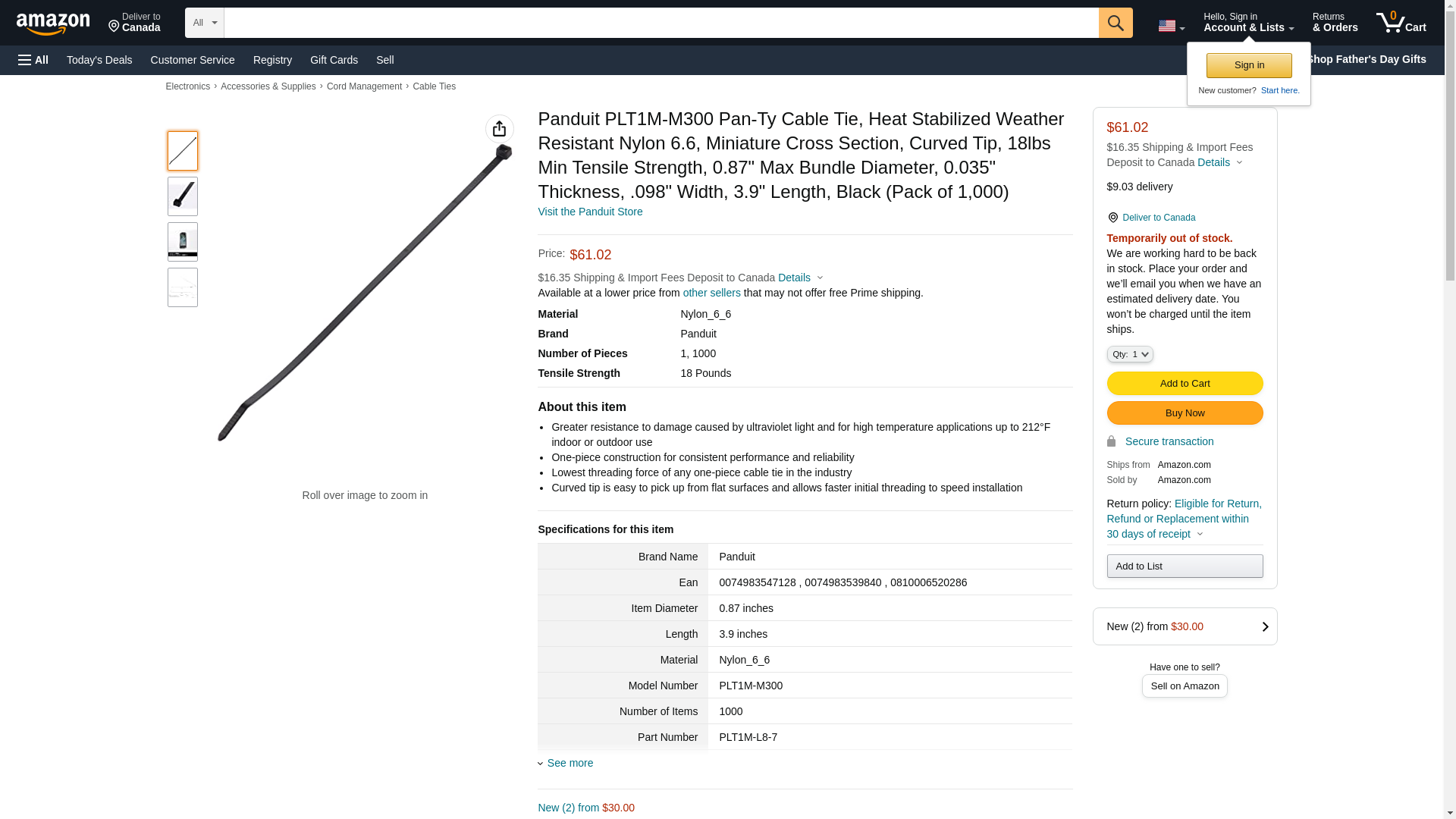 Panduit PLT1M-M300 Pan-Ty Cable Tie, Heat Stabilized Weather Resistant Nylon 6.6, Miniature Cross Section, Curved Tip, 18lbs Min Tensile Strength, 0.87" Max Bundle Diameter, 0.035" Thickness, .098" Width, 3.9" Length, Black (Pack of 1,000)