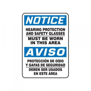 Bilingual OSHA NOTICE Signs (English & Spanish) - Hearing Protection And Safety Glasses Must Be Worn In This Area, 14" x 10". Aluminum signs can withstand wash downs, harsh elements, abusive conditions, and features good chemical, abrasion, and impact resistance. Excellent for indoor and outdoor usage, aluminum is ideal for a wide variety of industrial-strength applications. All Aluminum signs feature Accuform "Duck Armor" liquid-based UV-protective coating which prevents fading and resists chemicals, abuse, and graffiti. <br>Service temperature range is -40 to 250F.