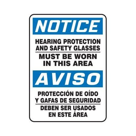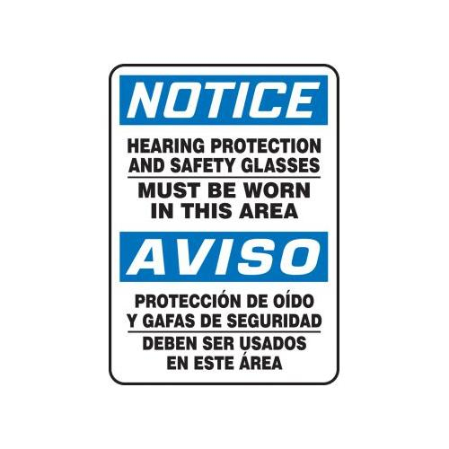 Bilingual Spanish OSHA Notice Safety Sign: Hearing Protection and Safety Glasses Must Be Worn in This Area, Aluminum, 14" x 10"