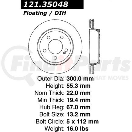 Centric C-Tek Brake Rotor - 300 mm OD - 22 mm Thick - 5 x 112 mm Bolt Pattern - Iron - Natural 121.35048