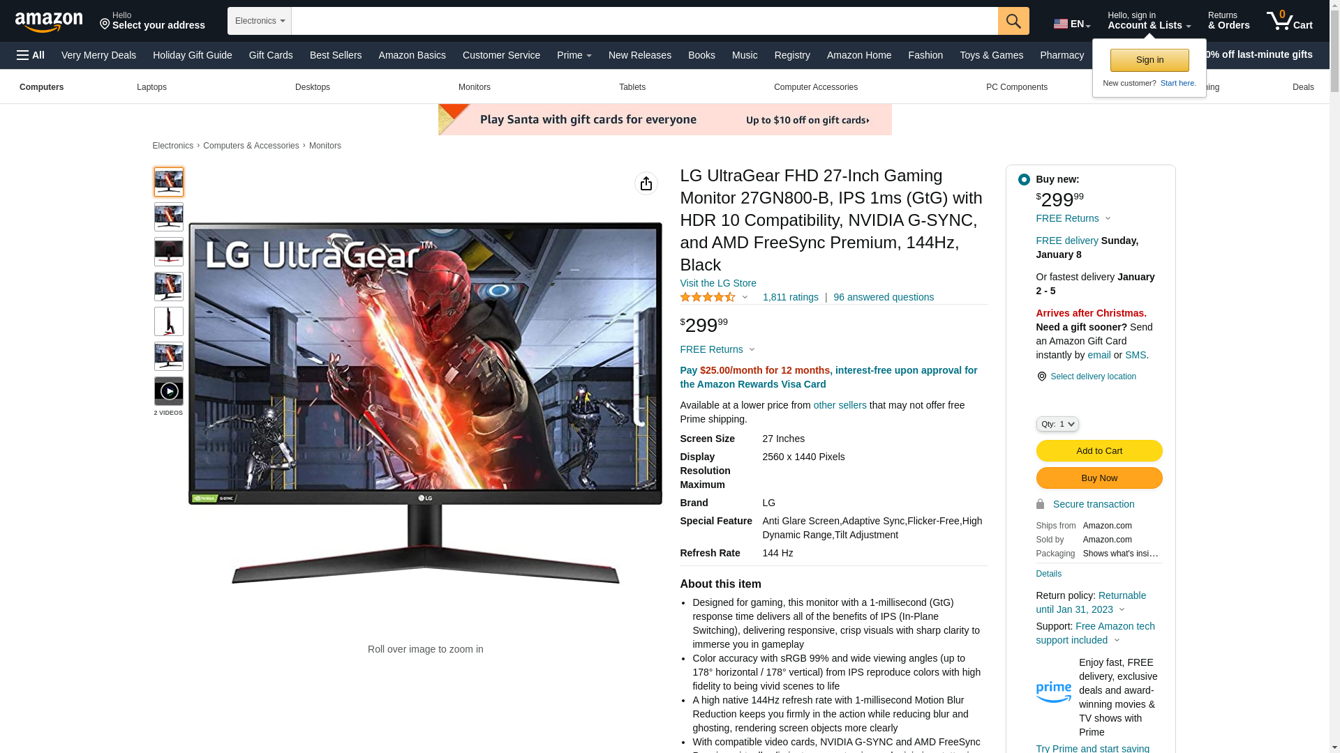 LG UltraGear FHD 27-Inch Gaming Monitor 27GN800-B, IPS 1ms (GtG) with HDR 10 Compatibility, NVIDIA G-SYNC, and AMD FreeSync Premium, 144Hz, Black