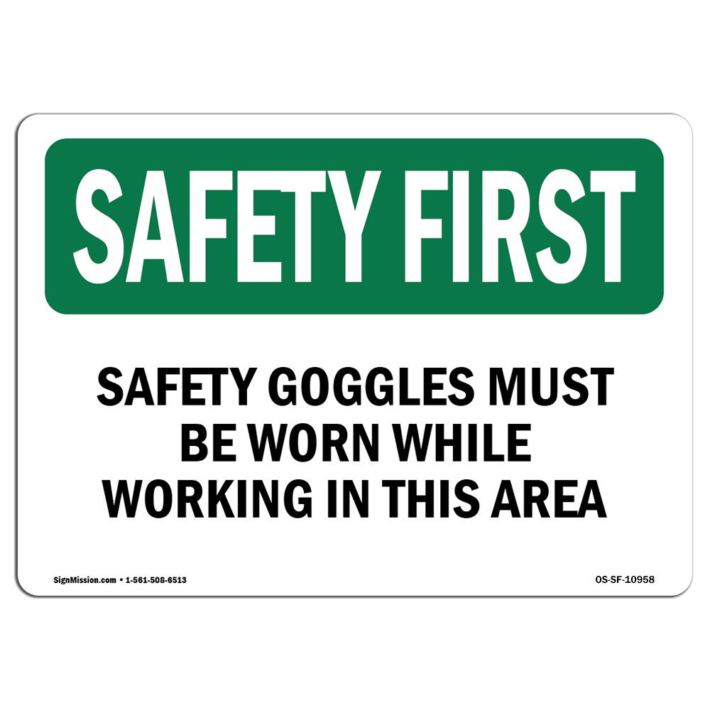 SignMission OS-SF-D-1824-L-10958 Safety First Safety Goggles Must Be Worn While Working OSHA Decal Sign